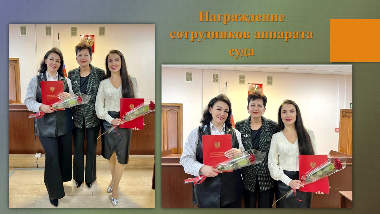 ![]() За высокие результаты в деле организации обеспечения деятельности федерального суда общей юрисдикции, добросовестное исполнение должностных обязанностей и личный вклад в укрепление органов правосудия Российской Федерации, на оперативном совещании судей и работников аппарата суда 17 декабря 2025 года председателем суда Ягодкиной Надеждой Владимировной были награждены Почетными грамотами Судебного Департамента при Верховном суде Российской Федерации помощник судьи Евстратова Ирина Александровна, заместитель начальника отдела Богданенко Юлия Юрьевна и начальник отдела Милоградова Екатерина Константиновна. Председатель суда поздравила награжденных сотрудников аппарата, поблагодарила за работу и пожелала дальнейших успехов в карьере. |